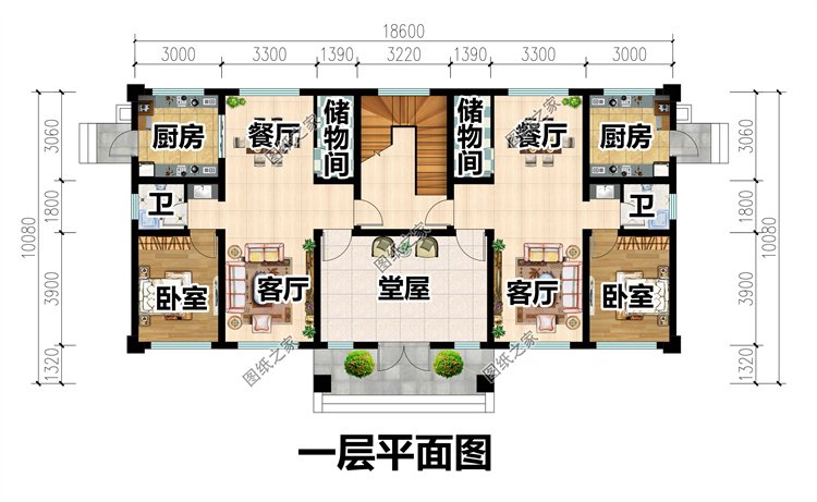 一层房屋户型:堂屋、客厅、厨房、餐厅、卫生间、老人房(带卫生间);
