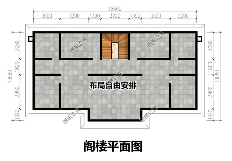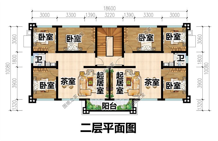 二层房屋户型:主卧(带卫生间衣帽间)、卧室(带卫生间)、棋牌室、书房、卫生间、阳台;
