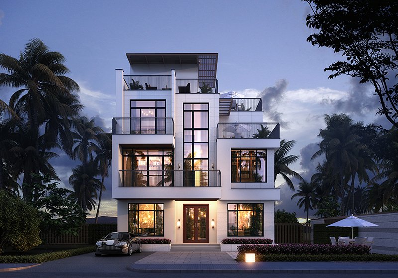乡村别墅现代风平屋顶四层自建房设计图,简约时尚