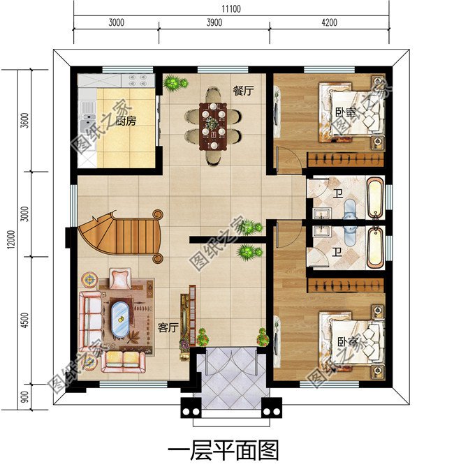 一层户型:客厅、餐厅、厨房、卧室(带卫生间)、卧室、卫生间;
