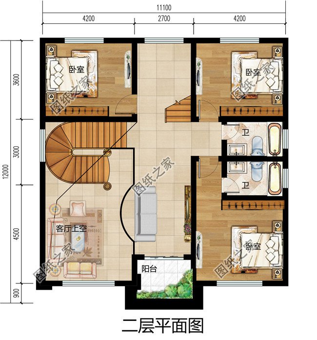 二层户型:客厅上空、小客厅、卧室(带卫生间衣帽间)、卧室x2、卫生间、阳台;注:客厅可做成复式或者不复式