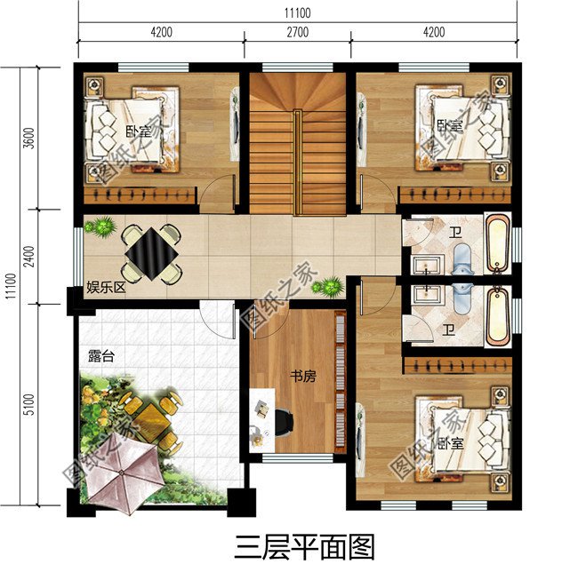 三层户型:娱乐区、卧室(带卫生间)、卧室x2、书房、卫生间、露台;