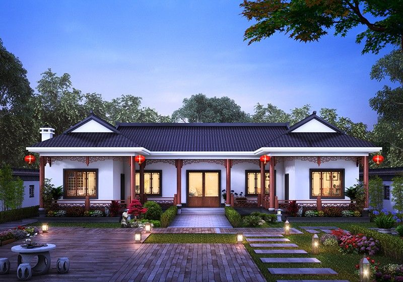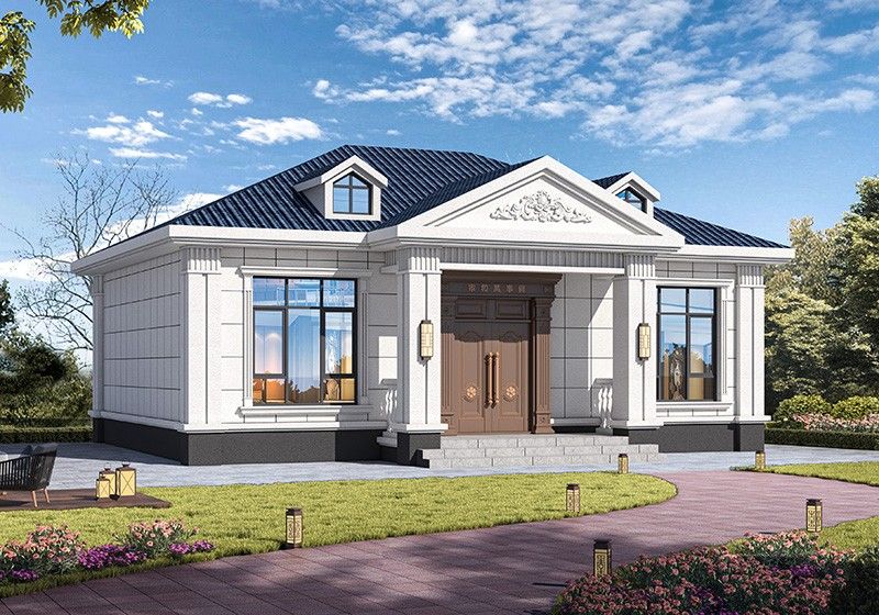 图纸介绍:本方案四个户型,B、C、D户型介绍及户型展示往下拉。农村小别墅一层设计图纸,经济大气,这才是农村房子该有的样子,户型时尚大气,造价经济,清新浅色的外墙搭配鲜艳的蓝色屋顶,给人一种强烈的视觉对比感,门廊的设计增添房屋设计感。符合农村的环境和审美需求,入户是大客厅,可设计堂屋神龛。四间卧室偏居一隅互不影响,非常方便。